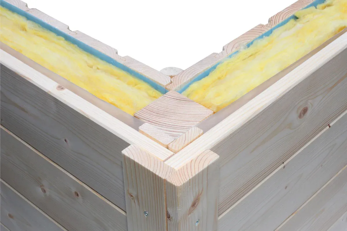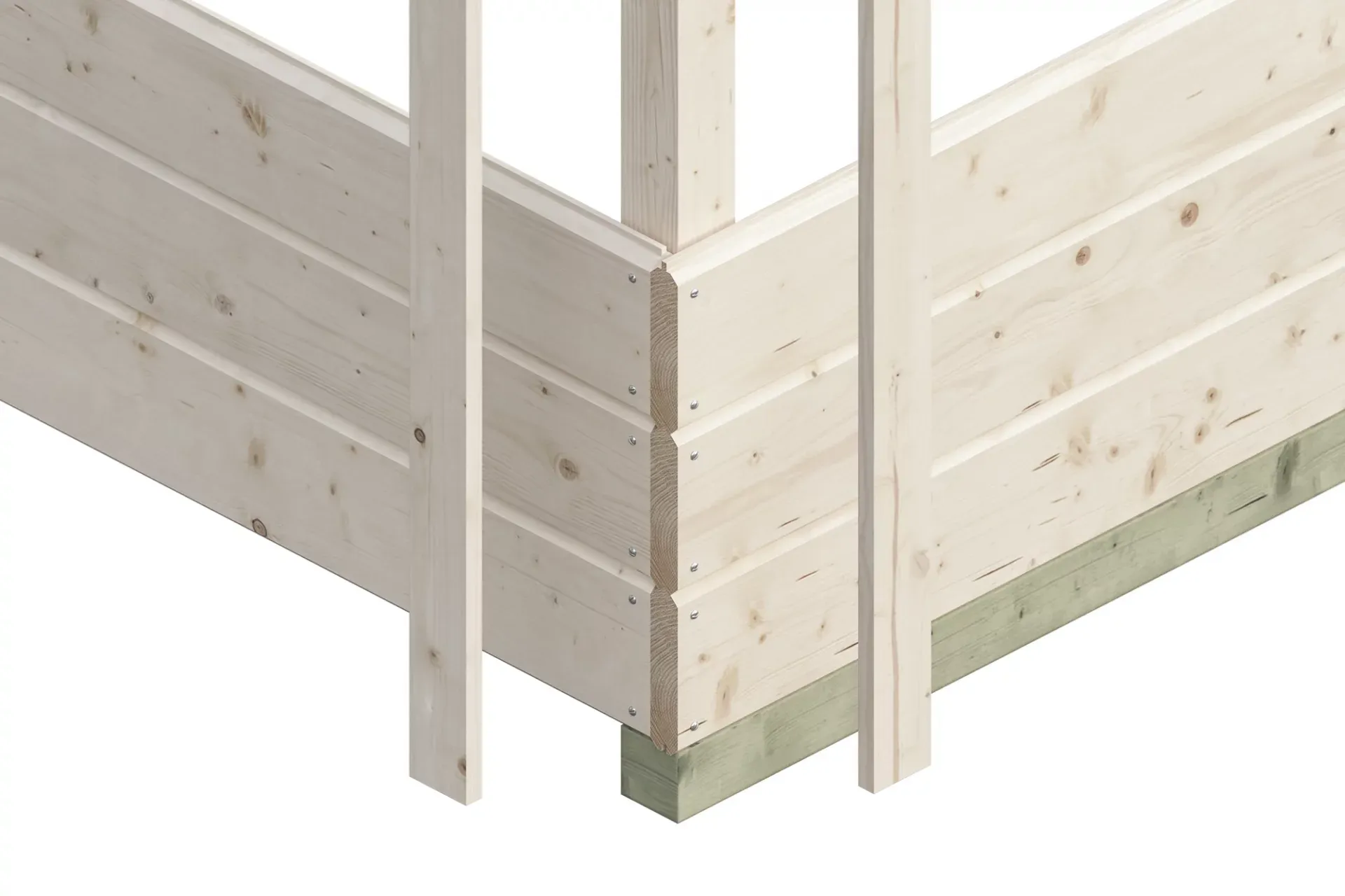 Die Wandbohlen werden einfach übereinander gesteckt und mit dem unsichtbaren, innenliegenden Windverband wird das Haus gegen Schäden durch Unterwind oder Sog gesichert. Auch hier ist der Vorteil, dass der Raum bis in die letzte Ecke genutzt werden kann, wenn man z.B. ein Regal aufstellen möchte..