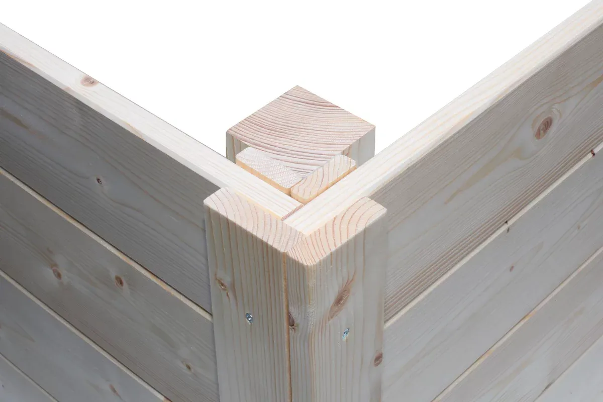 Bei unseren Produkten der Serie TREND werden die Wandbohlen übereinander gesteckt und an den Ecken mit einem Pfosten ohne seitlichen Überstand verschraubt. Man nennt dieses System auch Steck-Schraubverbindung oder stumpfe Eckverbindung.